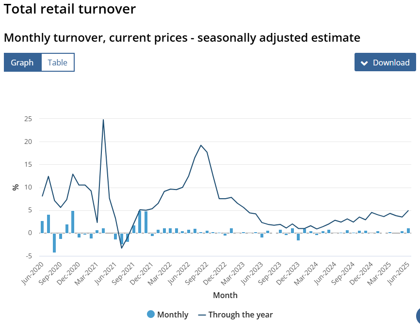 Australian Bureau of Statistics Released the Latest Retail Trade DataIndustry insights:Australian Bureau of Statistics released the latest retail trade data. The June 2025 seasonally adjusted estimate: Rose 1.2% month-on-month. Rose 4.9% compared with June 2024. In volume terms, the seasonally adjusted estimate rose 0.3% in the June quarter 2025.See more -